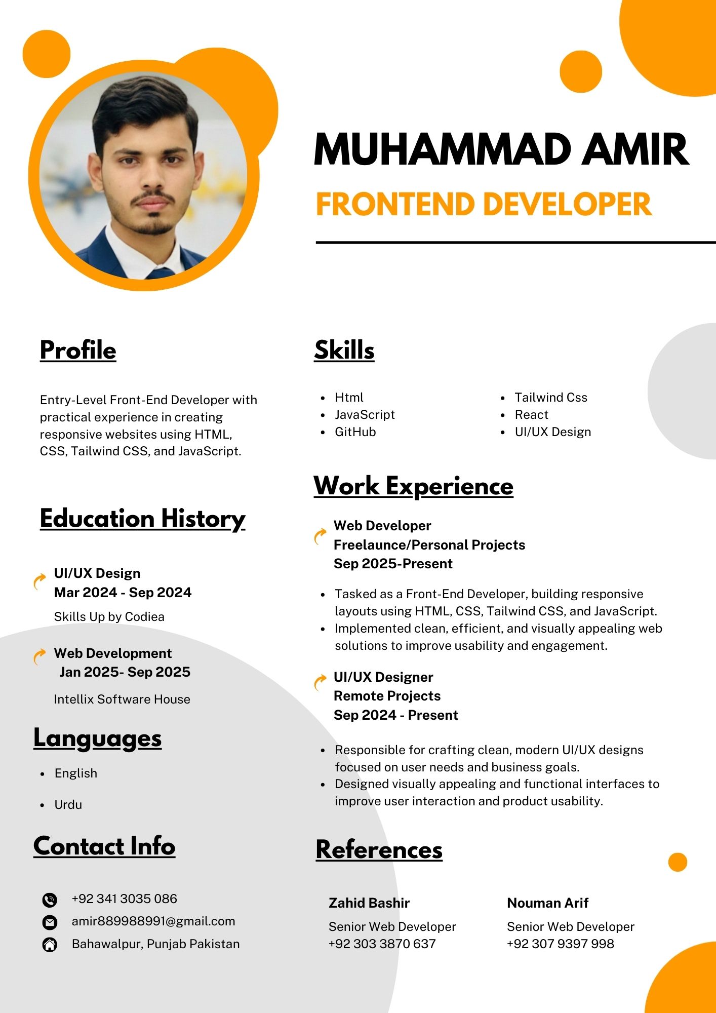 I'm Muhammad Amir, a passionate Frontend Developer dedicated to crafting responsive, user-friendly, and visually appealing web experiences. I specialize in transforming design ideas into fully functional digital interfaces using modern technologies like HTML, CSS, JavaScript, and React.